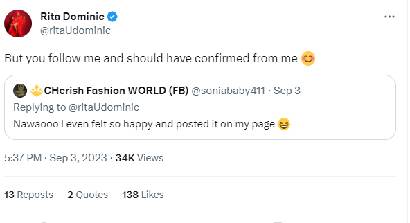 Many anticipated when they would have their first baby, some people even started talking about it in November last year. According to Rita Dominic, it was all just rumours. She made this known on her X page. After posting a picture, she wrote, “Fake news.”