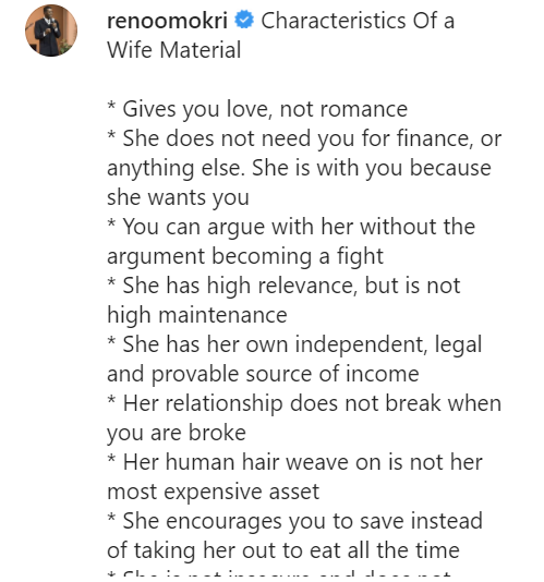 Former presidential spokesman and author, Reno Omokri listed what he believes to be the characteristics of a good wife material.