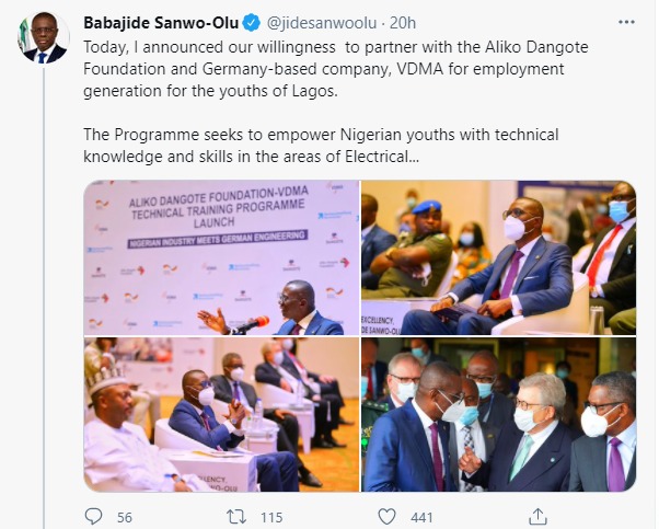 He announced his willingness to partner with the Aliko Dangote Foundation and Germany-based company, VDMA for employment generation for the youths of Lagos.