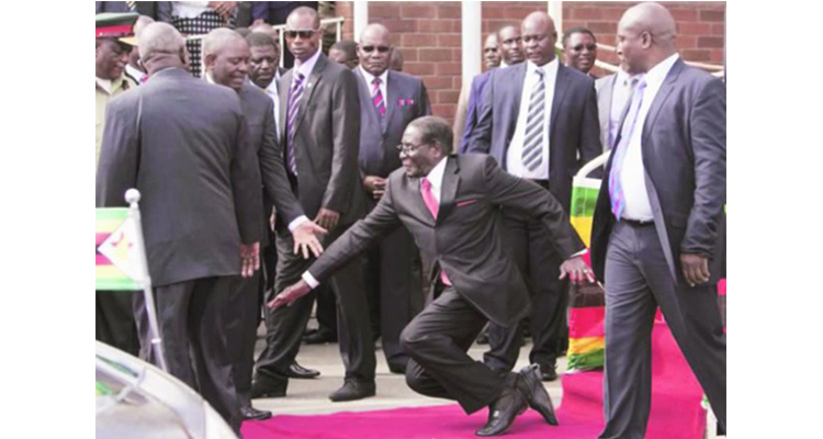 Speaking off the cuff for slightly over 43 minutes following a four-hour flight from Addis Ababa, Ethiopia, where he spent a busy week chairing AU plenary meetings in addition to meeting African leaders, President Mugabe turned to leave the podium and was walking down a flight of steps when he tripped over.