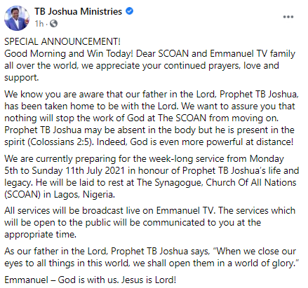 The TB Joshua Ministries made this announcement through their official Facebook as they indicated a week-long service of songs that will be held from Monday, July 5 to July 11 in his honour.