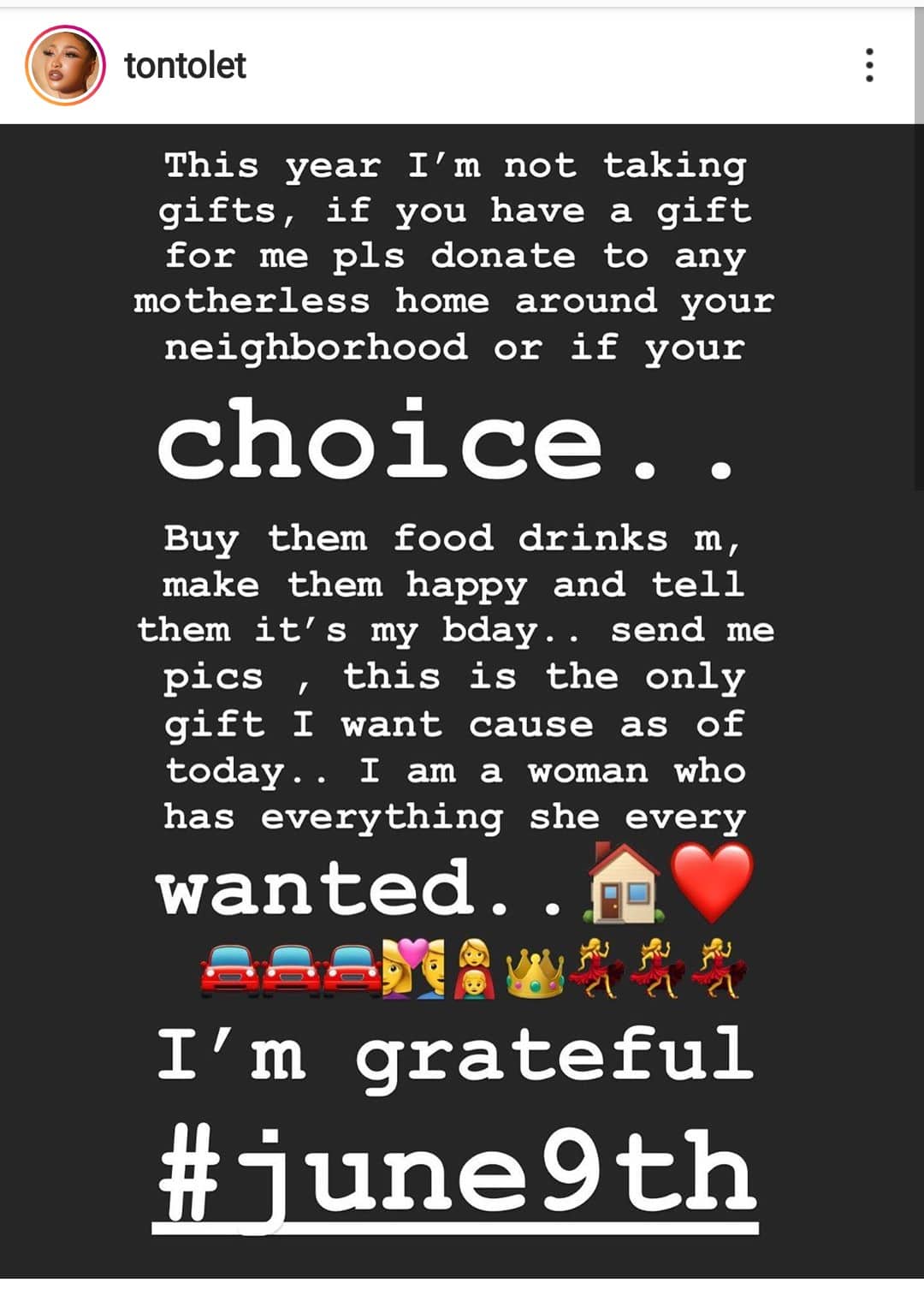 “Buy them food, drinks, make them happy and tell them it’s my birthday. Send me pics. This is the only gift I want. Cos as of today, I am the woman who has anything she always wanted. I’m grateful.”